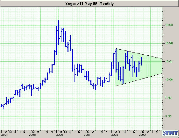 Sugar is impressive so far this year. The market is holding up despite a commodity selloff due to stock market declines and general fund liquidation. Pepsi's move to develop a new product made entirely of cane sugar should be seen as a potential trend change worthy of a close look by sugar traders. The move away from corn ethanol is another big plus for sugar. Global cutbacks on supplies after two years of major carryover inventories also bodes well for this commodity in 2009. This is a market to get bullish with long term, and to grab any dips as buying opportunities.