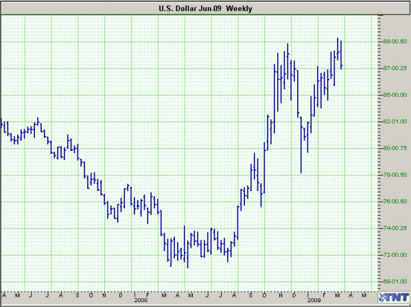 The G-20 meets officially the first week of April, and many anticipate a collusion of sorts to have their home countries spend more on bailout funds. However a pre-meeting this weekend went poorly in some analysts' minds as it seems the hype heading into this upcoming meeting will result more in a buy the rumor, sell the fact scenario. This week the Fed meets to determine interest rate policy, a meeting that is unlikely to change the free money policy we currently implement. The meeting should provide an avenue for the Fed to reinforce their spend-a-thon approach. What is important to take away from these two events is one overriding trend. The U.S. dollar will continue to be strong until the world sees someone else take charge. The U.S. is clearly the aggressor in this fight against global depression and that means a strong dollar.