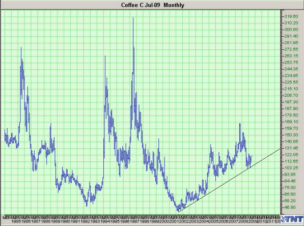 Coffee spiked this week as short covering brought the market above 120 (can you believe this market is still holding perfect trend line support since 2001?!). Look for a move to 135 as early as this week. Uganda, Honduras, Brazil and others are all going to come up short this year and the market is going to have to wrap its head around the idea that 2009 is the year of the supply shortage rally in coffee. Cyclically speaking we have been waiting for this for nearly a decade. Cocoa continues to be a short as I feel the highs are in. This market just doesn't have the fundamental issues it had in 2008, and the run for chocolate demand disappeared when the economy faultered. OJ remains a seasonal and value buy. Sugar broke out and is very bullish, possibly supported further by a run in corn and oil in coming weeks. Cotton remains on top of the list of bullish commodities in 2009. Lumber remains an economy bull play.